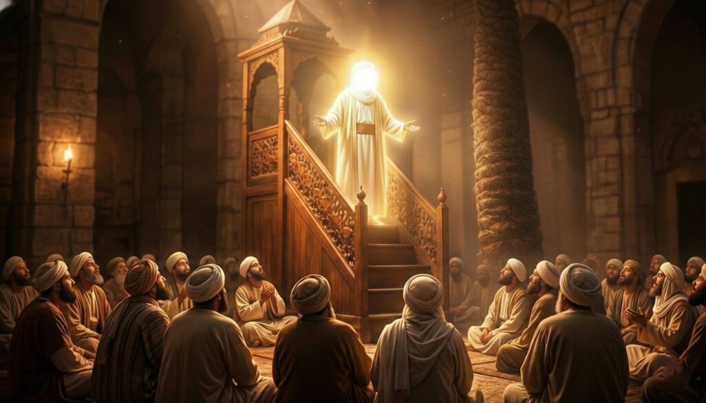 Pada masa-masa awal di Masjid Nabawi, belum ada mimbar yang megah. Saat itu, Rasulullah ﷺ biasa berkhutbah sambil bersandar pada sebuah batang pohon kurma tua (Al-Jidz’u) yang tertancap di dekat mihrab.