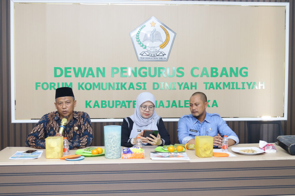 Sukahaji (KEMENAG) – Dewan Pengurus Cabang Forum Komunikasi Diniyah Takmiliyah (DPC FKDT) Kabupaten Majalengka menyelenggarakan Rapat Koordinasi (Rakor) bersama jajaran Pengawas Madrasah dan perwakilan DPAC se-Kabupaten Majalengka. Kegiatan yang berlangsung di Sekretariat FKDT, Perum BCA Desa Cikalong, Kecamatan Sukahaji pada Kamis (23/4/2026) ini menjadi istimewa dengan kehadiran Kepala Kantor Kementerian Agama (Kemenag) Kabupaten Majalengka, Dr. Hj. Euis Damayanti, M.P.Kim.